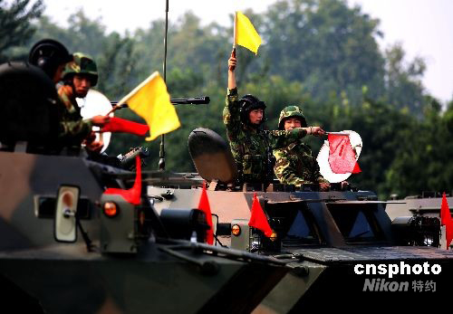 8月27日,濟南軍區某機械化步兵旅參加“勵兵--2008”演練,根據演練計劃,這支機械化步兵部隊與北京軍區一支數字化部隊舉行跨軍區聯合實兵對抗,雙方在為期一個月內進行現代條件下“背靠背”的立體化攻防演練,攻擊與反殲雙方將根據作戰任務和“情報”實施作戰計劃,以磨練部隊的戰斗能力。中新社發 宋吉河 攝
