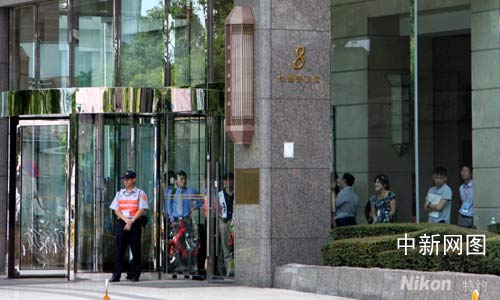 8月28日下午二時半至三時,臺北市舉行“萬安演習”,街上行人凈空。圖為臺北市新光人壽曼哈頓世貿大樓。警察正守在大門口,民眾只能呆在樓內。等待演習完再出街。攝影 陳立宇
