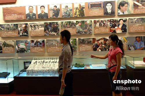 9月20日上午,中國人民革命軍事博物館青年講解員正在為“‘萬眾一心 眾志成城’--抗震救災主題展覽”欄目背誦講解詞。由中共中央宣傳部、國家發展和改革委員會、解放軍總政治部共同主辦的此項展覽,將于9月21日正式對公眾開放。該展覽為汶川大地震后,北京舉辦的反映抗震救災工作,規模最大,文物最多,圖片形象最為詳盡的展覽之一。中新社發 鄒憲 攝