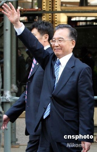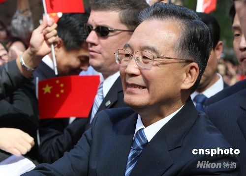 中國總理溫家寶當地時間23日上午乘專機抵達紐約,數千華僑華人當天一早即聚集在他下榻的酒店附近,揮舞中美兩國國旗夾道歡迎。中新社發 李靜 攝