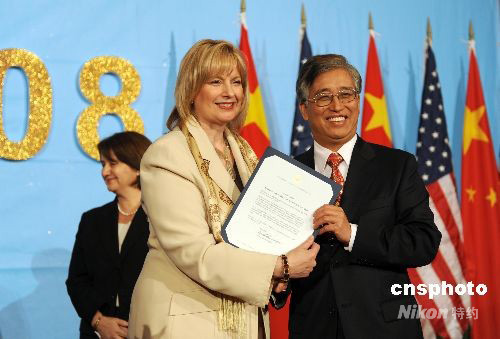 圖為加州州長代表向中國駐洛杉磯總領事張云遞交加州州長施瓦辛格的祝賀信,施瓦辛格在信中感謝華人華僑為加州做出的貢獻,并向他們致以國慶祝賀。中新社發 張煒 攝