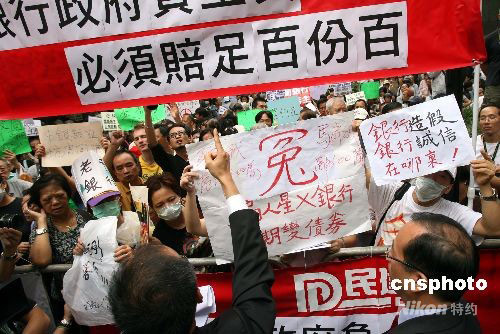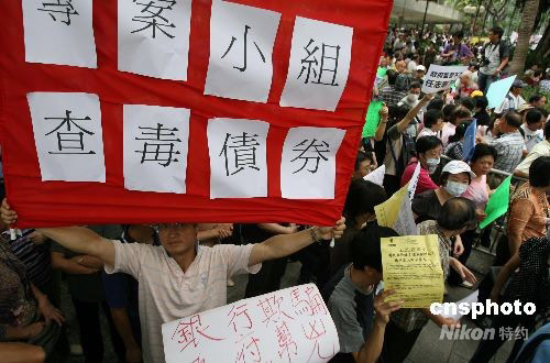 受雷曼迷你債券事件影響的香港市民,在香港立法會前請愿。中新社發 洪少葵 攝