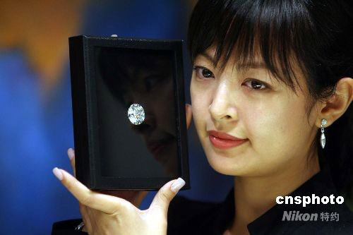 十月八日,香港佳士得向傳媒展示一批將于十二月二日拍賣的瑰麗珠寶首飾,圖中的四十四點四六克拉完美無暇巨鉆,估價超過六千萬港元。中新社發 洪少葵 攝