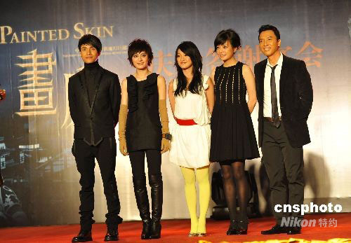 10月8日,電影《畫(huà)皮》舉行盛大慶功會(huì),慶祝奇跡票房紀(jì)錄。9月26日引爆全國(guó)院線的東方新魔幻影片《畫(huà)皮》在上映當(dāng)日票房達(dá)到1520萬(wàn)元,隨后6天過(guò)億,10天狂收1.43億,在同等時(shí)間內(nèi),該成績(jī)已超過(guò)《投名狀》、《集結(jié)號(hào)》、《長(zhǎng)江七號(hào)》等多部國(guó)產(chǎn)大片。截至10月8日,該片票房已高達(dá)1.7億。面對(duì)此驕人成績(jī),制片方更放出豪言——《畫(huà)皮》過(guò)兩億沒(méi)有懸念。圖為《畫(huà)皮》主演陳坤、孫儷、周迅、趙薇、甄子丹在慶功會(huì)現(xiàn)場(chǎng)。中新社發(fā) 李學(xué)仕 攝