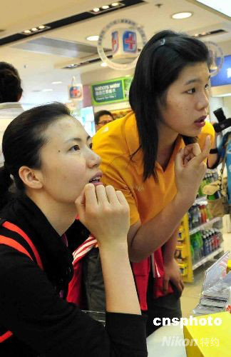 十月九日,中國女排展開訪問香港之旅,圖為隊員周蘇紅(左)等在商場選購化妝品。中新社發 譚達明 攝