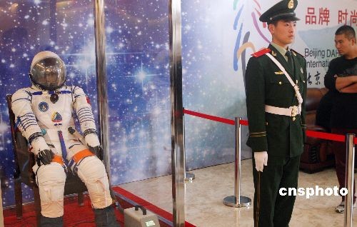 10月16日,2008北京大紅門(mén)國(guó)際服裝節(jié)暨文化創(chuàng)意論壇在北京開(kāi)幕,服裝節(jié)圍繞“品牌、時(shí)尚、活力”主題,利用多載體、多形式、多角度開(kāi)展系列活動(dòng)。圖為在北京大紅門(mén)國(guó)際服裝節(jié)開(kāi)幕式上展示中國(guó)“神七”艙內(nèi)航天服。中新社發(fā) 錢(qián)興強(qiáng) 攝
