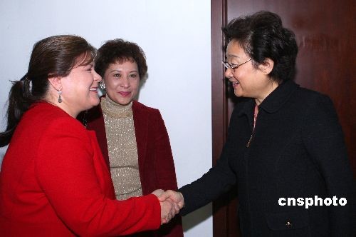 10月20日,由國務院僑務辦公室和中國海外交流協會主辦的首屆國際禮儀培訓班在北京開課。國務院僑辦主任李海峰歡迎并會見授課講師、美國前政府白宮高級禮賓官羅拉·埃福德。中新社發 廖文靜 攝