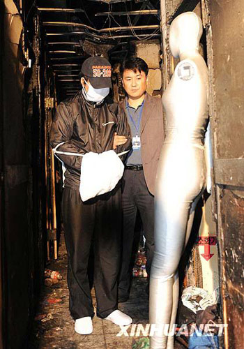 10月23日上午,韓國警方與20日在首爾某旅館制造縱火行兇事件的嫌犯鄭某(戴口罩者)到案發現場取證。鄭某在20日的縱火行兇事件中造成6死7傷,有三名中國婦女被鄭某殺害,另有三名中國婦女受傷。新華社/韓國紐西斯通訊社