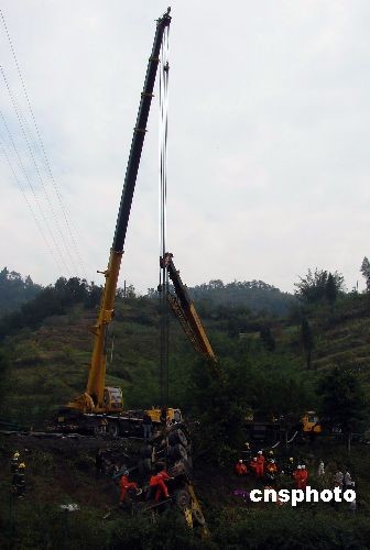 11月2日11時(shí)50分許,渝黔高速公路重慶至一品段10公里處,一輛長江牌吊車因爆胎導(dǎo)致車輛失控,沖出護(hù)欄發(fā)生側(cè)翻,造成1人死亡,1人重傷。中新社發(fā) 張東清 攝