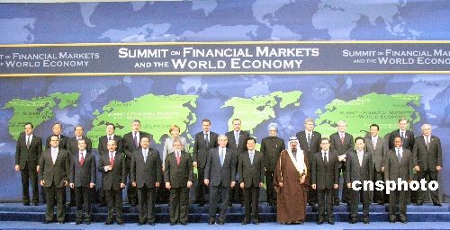 二十國集團領導人金融市場和世界經濟峰會15日在美國首都華盛頓舉行,中國國家主席胡錦濤出席會議并發表重要講話,圖為各與會領導人在會前合影。中新社發 齊彬 攝