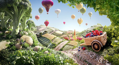據英國《每日郵報》報道,英國食物攝影師卡爾·華納最新拍攝了一組作品,將菜市場菜肴變成了一張張藝術杰作。初一看它們好像是一般的風景畫,然而這些獨特的美術品卻是菜肴藝術品,因為其所有素材都是食品。比如,讓大蒜氣球漂浮在椰菜地里。