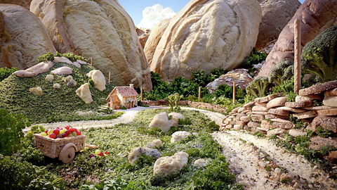 烤面包構成了此阿爾卑斯山風景的背景,有斯第爾頓奶酪和切達干酪巖石、薄脆餅干的屋子、花椰菜云彩和面包屑鋪就的鄉間小路。