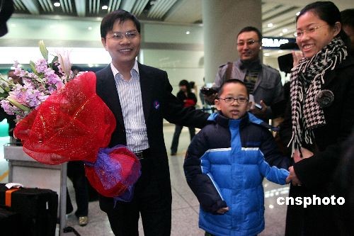 11月30日清晨5點30分左右,滯留泰國的中國公民搭乘中國國際航空公司的CA072航班順利抵達北京首都國際機場。圖為從泰國返回北京的中國公民黃忠(左)走出機場,他的妻兒到機場迎接。