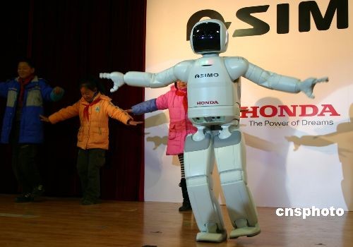 12月9日,目前世界上最先進(jìn)的類人型機(jī)器人ASIMO在四川都江堰進(jìn)行系列節(jié)目表演,拉開(kāi)“ASIMO中國(guó)行”系列活動(dòng)的序幕。圖為ASIMO與當(dāng)?shù)睾⒆颖荣悊瓮泉?dú)立。中新社發(fā) 黃永莉 攝