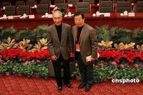 新當選的中國美協(xié)榮譽主席靳尚誼(左)和新當選的中國美協(xié)主席劉大為合影。中新社發(fā) 王保勝 攝
