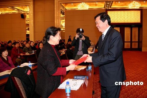 中國文聯(lián)黨組副書記、副主席李牧給新當選的中國美協(xié)顧問常沙娜頒發(fā)聘書。中新社發(fā) 王保勝 攝