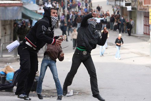 巴勒斯坦人向以色列士兵投擲石塊。27日,上百名巴勒斯坦人在希伯倫抗議以軍空襲加沙,并與以色列士兵發生沖突。
