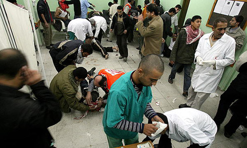 12月29日,在加沙地區(qū)北部的一家醫(yī)院,巴勒斯坦傷員躺在地板上接受醫(yī)護人員的治療。 由于以色列對加沙地帶的持續(xù)封鎖,加沙醫(yī)院的醫(yī)療條件非常惡劣。空襲造成的大量人員傷亡讓加沙醫(yī)院幾乎面臨崩潰。