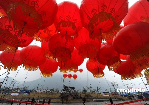 2009年元旦節,四川大地震極重災區的北川縣擂鼓鎮板房區廣場大紅燈籠高高掛,為災民生活增添色彩。中新社發 賈國榮 攝