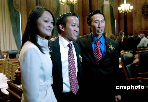 當(dāng)?shù)貢r間一月八日,舊金山市議會當(dāng)選議員宣誓就職,并選舉出舊金山歷史上首位華裔議會主席邱信福。舊金山市歷史上首次同時出現(xiàn)三位華裔議員邱信福(中)、朱嘉文(左)和馬兆光。圖為三位華裔議員宣誓后合影。中新社發(fā) 陳鋼 攝