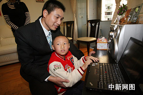圖為龍志賢(左三)與父母及妻兒一道展示習近平副主席贈送的筆記本電腦。