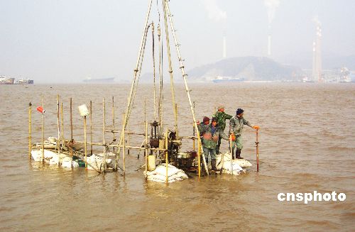 1月12日9時30分許,4名大橋施工員在浙江省臺州市海門港椒江二橋建設工地上測量時,被上漲的潮水困在港內工地上。接到報警后,臺州邊防支隊迅速派遣公邊艇前往營救,經過近1個時努力,4人終于成功脫險。中新社發 郟策 攝