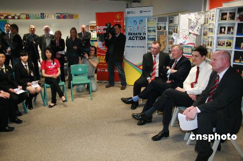 圖為米利班德(右二)和弗格森(右三)與該校師生在一起座談。