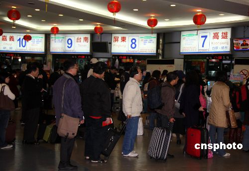 臺北的長途客運站出現了排隊等車回鄉的人龍。中新社發 陳立宇 攝