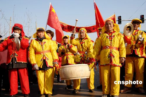 1月26日,山東費縣18鄉(xiāng)鎮(zhèn)新農村文藝演出隊進城串街表演,他們自編自演精彩的舞獅、舞龍、高蹺、秧歌等傳統(tǒng)民間節(jié)目,將黨的惠農政策和新農村建設成果融入演出中,與城里人一同歡慶新春佳節(jié),自由抒發(fā)新年豐收喜悅。中新社發(fā) 劉 濤 攝