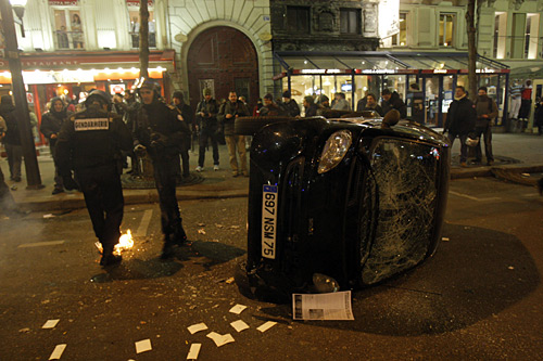 中新網(wǎng)1月30日電 法國(guó)全國(guó)有逾百萬人在29日罷工,抗議總統(tǒng)薩科齊處理金融危機(jī)的手法未能令工人受惠。在巴黎,示威演變成騷亂,示威者在商業(yè)大街?jǐn)S玻璃樽和放火,更與警方爆發(fā)推撞,警方施放催淚氣體驅(qū)散群眾。