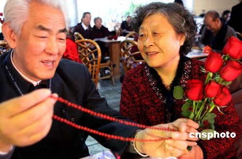 2月9日,中國傳統元宵佳節到來之際,北京植物園上演的“浪漫玫瑰文化周”吸引99對金婚夫婦共度元宵佳節,特邀而來的金婚夫婦(結婚滿50年)手捧著政府當年頒發的不同版本的結婚證,相互獻上象征愛情的紅玫瑰、相思紅豆,交換金婚禮物,重溫愛的誓言,在鮮花前回憶浪漫的美好時光,許多長者回憶起風風雨雨幾十年的時光,激動得熱淚盈眶。中新社發 錢興強 攝