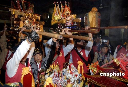 2月13日,臺灣信眾抬媽祖神像到湄洲島媽祖祖廟進香謁祖。當日,428名臺灣媽祖信眾第一次經由海上客運直航抵達湄洲島媽祖祖廟進香謁祖。這是2008年底海峽兩岸簽訂“兩岸海運協議”后的第一個兩岸海上客運直航活動,也是湄洲島口岸繼與金門、馬祖實現海上客運通航后的又一突破。中新社發 王東明 攝