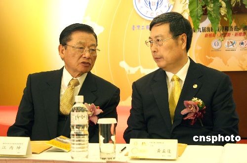 圖為臺灣海基會董事長江丙坤(左)與中華全國工商業聯合會主席黃孟復交談。中新社發 陳立宇 攝