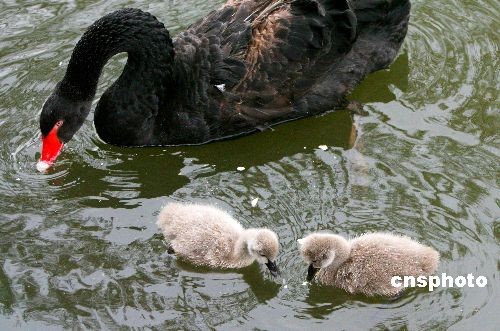 2009年2月21日,古城蘇州春風送暖,陽光明媚,蘇州動物園里兩只剛出生半個多月的黑天鵝寶寶由其鵝爸、鵝媽的引領下,舉家進入池塘戲水覓食,為游客增添了許多游園情趣。中新社發 王建中 攝