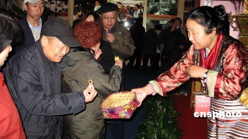 2月25日,在北京民族文化宮舉辦的《西藏民主改革50年大型展覽》免費向民眾開放,來自西藏的藏族同胞現場向觀眾發放藏族小麻花等禮品。中新社發 鄒憲 攝