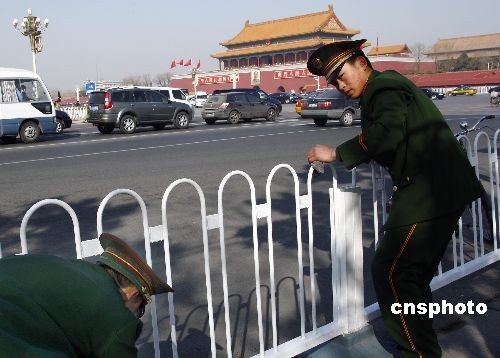 2月27日,全國(guó)“兩會(huì)”即將召開,北京天安門廣場(chǎng)進(jìn)行全面清潔整理工作,以迎接“兩會(huì)”開幕。中新社發(fā) 鄭雄增 攝