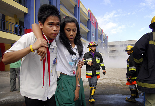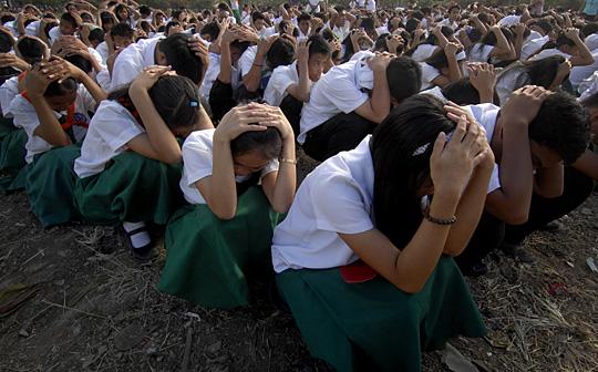 2月27日,在菲律賓大馬尼拉區的奎松城,參加地震演練的中學生們蹲在開闊地帶用雙手護住頭部,同時他們的同學在協助消防部門救助“傷員”。菲律賓在全國范圍內舉行地震演練,以提高抵御災害的能力和突發事件救援的反應速度。