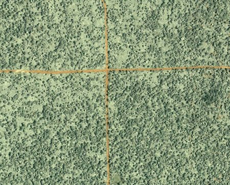 剛果森林:本圖由IKONOS商業衛星攝于2002年6月27日,顯示的是剛果共和國北部的森林。圖中劃過中心的桔色線條是骯臟的運送木材的公路。