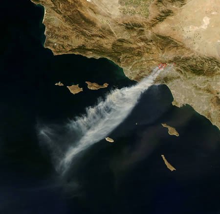 洛杉磯大火的煙霧:這張衛(wèi)星圖片上清晰可見,受強(qiáng)大的圣安娜颶風(fēng)影響,2008年10月中旬加州洛杉磯附近大火肆虐,風(fēng)助火勢(shì),濃濃的煙霧甚至飄向很遠(yuǎn)的海面。