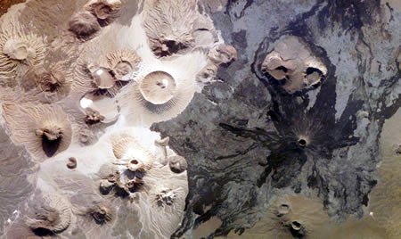沙特阿拉伯的火山巖:卡伊巴爾有大片的火山巖壯觀地貌,本圖由國(guó)際太空站宇航員攝于2008年3月31日,所示的阿爾齊答山由不同年代的黑色玄武巖熔巖流形成,圖中淺色部分則是更黏性、富含硅石的火山巖,又稱流紋巖。