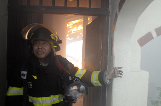 消防隊員進入火場施救。