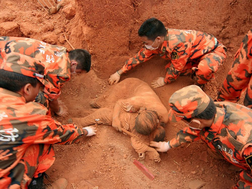 鄒森的這張照片,反映了地震對人類摧殘,同時也反映了生死瞬間母親的偉大。這張照片感動著世界。照片中的這位母親叫文學(xué)金,和女兒在“8.30”地震中遇難。