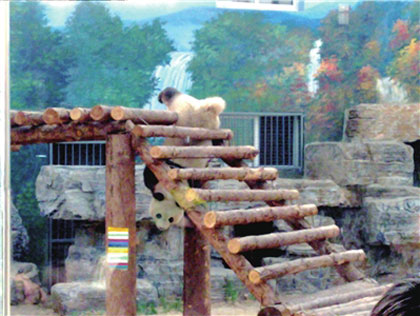 熊貓爬梯子的時候,一不留神,一頭栽進梯子兩格間的縫隙中,上半身順勢滑下去,攔腰卡在了梯子上。“整個身體懸在半空,真害怕它掉下去。”周圍數十名游客看到此情景,立即四處找飼養員來解救。