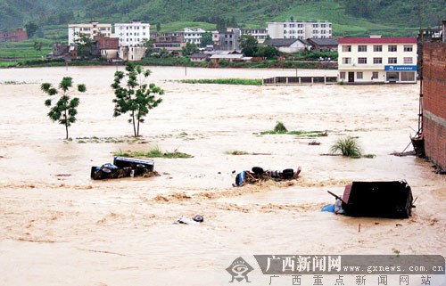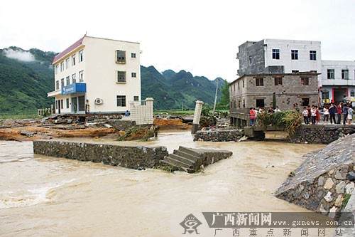 6月9日凌晨3時許,與貴州交界的環(huán)江毛南族自治縣馴樂苗族鄉(xiāng)遭受嚴(yán)重洪澇災(zāi)害,洪水淹沒大片田地,卷走多輛停放在馴樂街的汽車,馴樂河大橋坍塌,一名老年男子隨著被洪水卷走的房屋而失蹤。