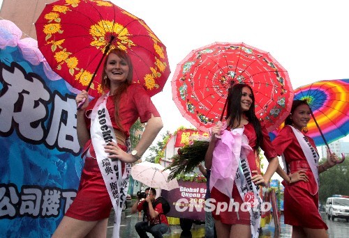 7月21日,“環(huán)球皇后”佳麗冒雨在牡丹江市街頭參加巡游活動。當(dāng)日,黑龍江省牡丹江市出現(xiàn)降雨天氣。上午9時,來自世界各地的60余名“環(huán)球皇后”佳麗乘坐20余輛花車,冒雨亮相在牡丹江城區(qū)主要道路。據(jù)悉,當(dāng)晚,2009年“環(huán)球皇后”大賽的“最佳才藝”單項(xiàng)獎將在牡丹江市角逐產(chǎn)生。中新社發(fā) 莊文斌 攝