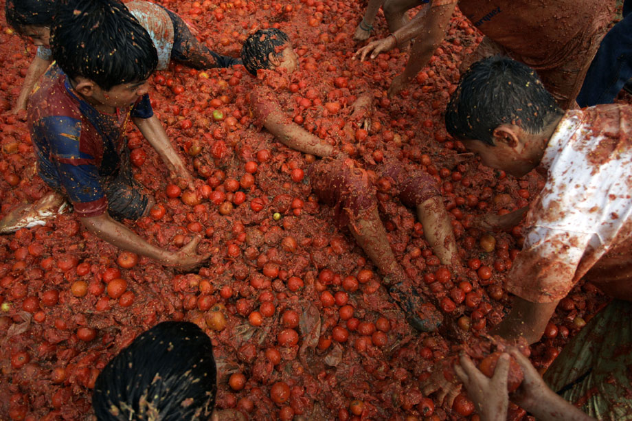 2009年6月14日,哥倫比亞第五屆番茄狂歡節開幕,參與者互相投擲西紅柿,盡情狂歡慶豐收。來自哥倫比亞各地的狂歡者們云集在首都波哥大東北部的蘇塔馬錢小鎮,街道上立刻變成了西紅柿紛飛的戰場。雖然每個人的臉上身上沾滿了西紅柿汁,但人們還是樂此不疲又是丟又是砸,把成堆的西紅柿當成打仗的“武器”。還有人特地穿上白衣白褲,身上越紅,心里就越痛快。
