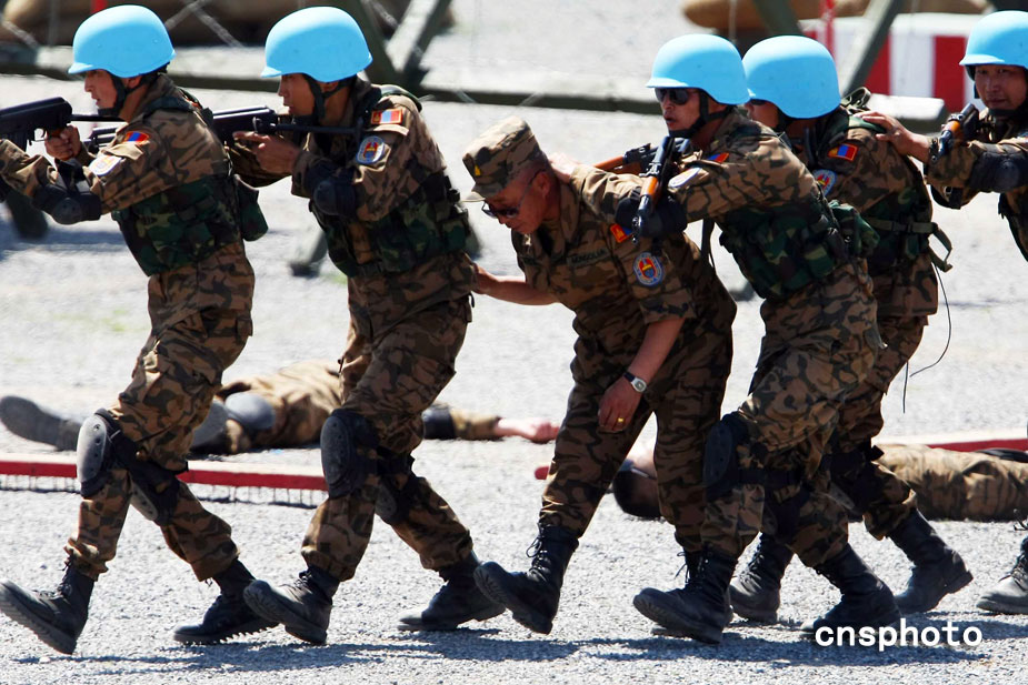 7月3日,中國和蒙古首次舉行維和聯合軍事訓練,以執行聯合國框架下維和任務為背景,在北京地區某訓練場開展多種綜合演練。中新社發 宋吉河 攝