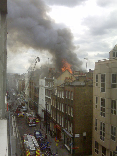 英國倫敦中部蘇豪區在當地時間10日下午2時左右發生火警,起火的5層高商業樓宇被嚴重焚毀,現場冒出大量濃煙,在倫敦市內多處均清楚可見。消防部門派出12輛消防車及60名消防員進行灌救。