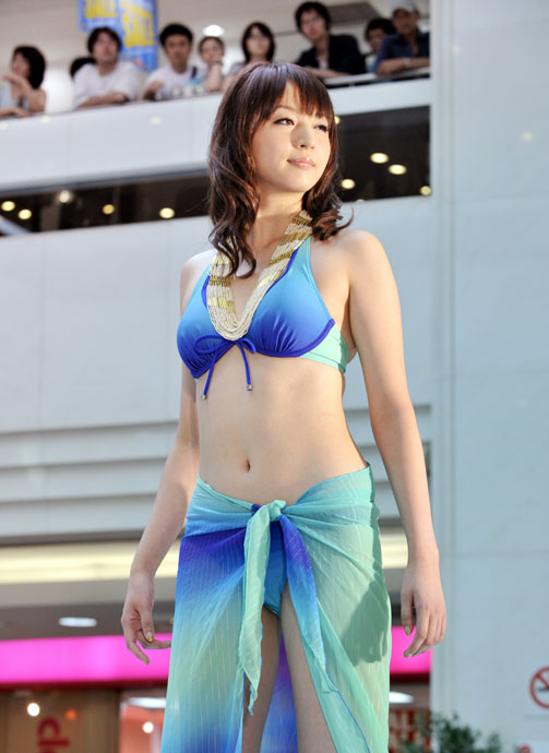 7月20日,在日本東京的一家購物中心,靚麗性感的模特泳裝走秀,慶祝日本的“海洋日”。每年7月的第三個星期一為日本的“海洋日”。