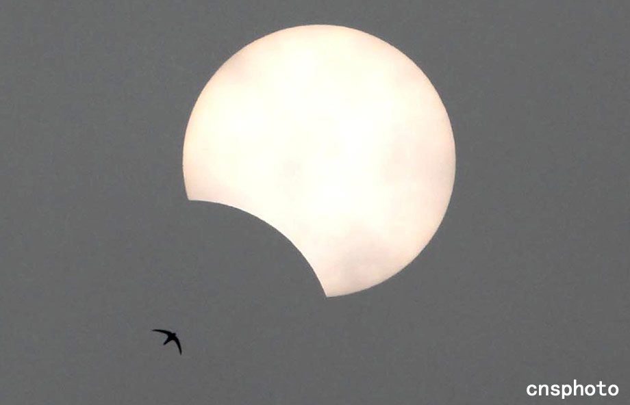 7月22日上午10點28分,北京上空出現的燕子爭相追逐日偏食奇觀。
